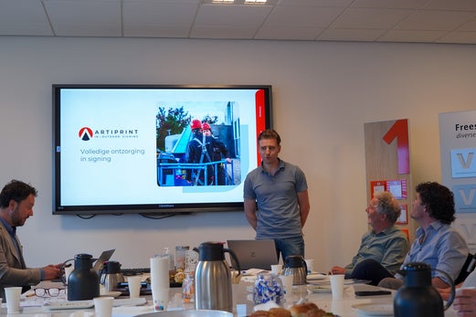 De middag begon met een gezamenlijke lunch en een rondleiding door het bedrijfspand van De Vries Projekt Design, gevolgd door het inhoudelijke programma. Daarin stonden onder andere de introductie van nieuwe leden: ArtiPrint en PanelPrint en hun projecten centraal, evenals de invulling van de studiereis.